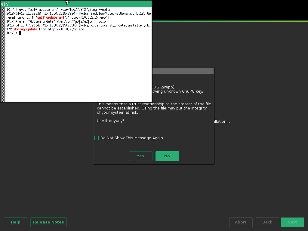 但更重要的是 AutoYaST 中对新功能的改进。如果你想使用自己的自更新仓库,你必须在启动命令行中指定它。这在单个安装中很容易,但如果你想使用 AutoYaST 安装许多机器,那么在每次安装时都输入可能很长的 URL 听起来很烦人。