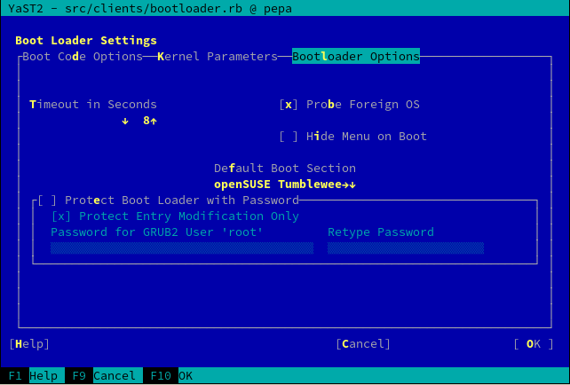 YaST2-Bootloader 中的密码保护小部件自 GRUB1 时代以来就没有改变过,但 GRUB2 允许更精细地调整密码设置。事实上,它包含一个完整的用户管理系统,其中多个用户可以具有不同的权限和不同的密码。对于 YaST,我们喜欢保持简单,因此仅支持“root”用户的密码。这让一些人感到困惑,所以我们决定通过调整一些标签来改善用户体验……并在过程中修复了一些拼写错误。 ![]()