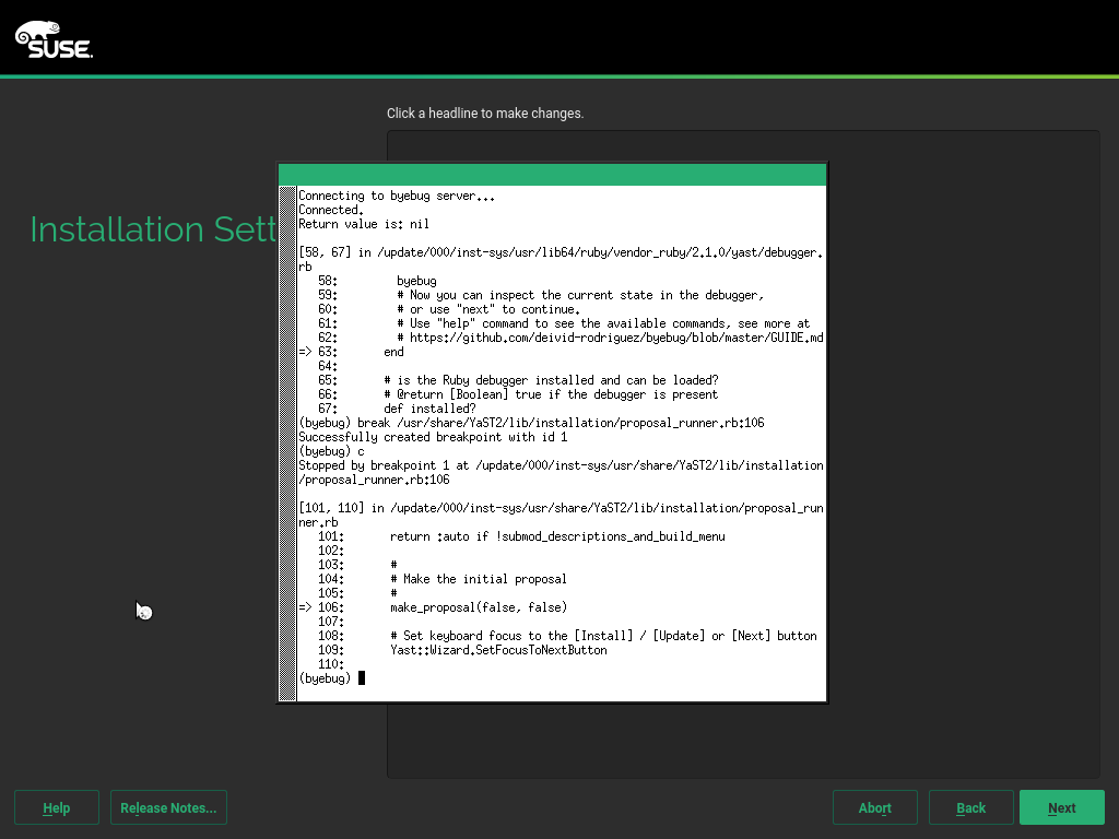 直到现在,调试 YaST 安装通常是通过检查日志来完成的。 如果你需要更多细节,你就会添加更多的日志调用。 这很不方便,而且耗时太长,但是正如每个 Ruby 开发者所知,还有更好的方法。
