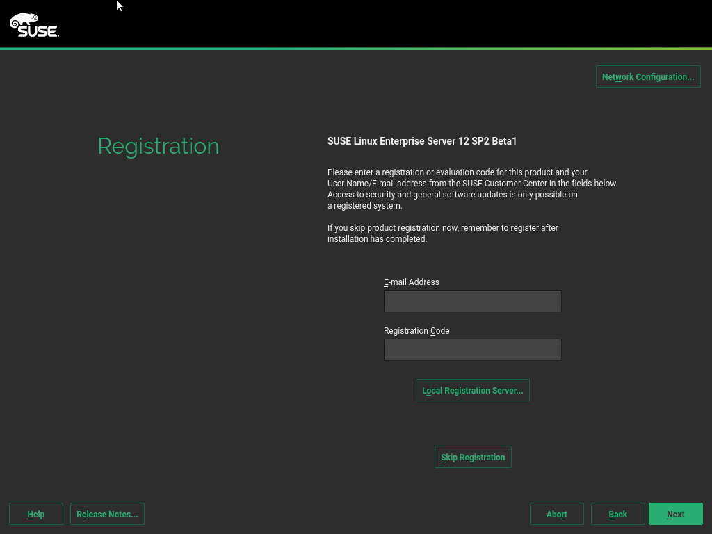 - 使用 scc.suse.com 注册系统,输入电子邮件和注册码。