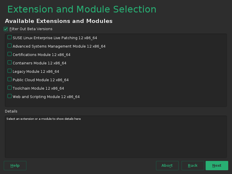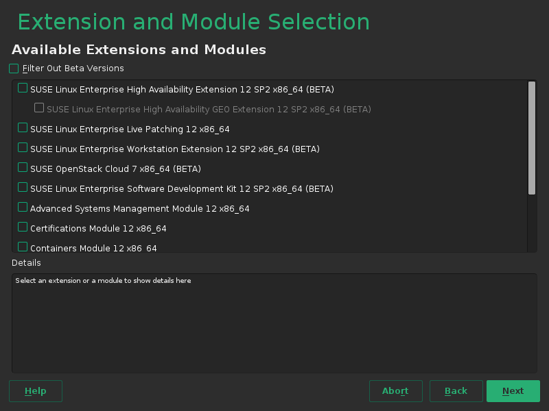 我们必须确保 YaST 适用于不同的界面,包括基于文本的 ncurses。这限制了我们在设计界面时可以使用的控件集,因此找到解决这类问题的方案并不总是容易的。我们还利用这个机会添加了 Beta 扩展的过滤器,如以下屏幕截图所示。