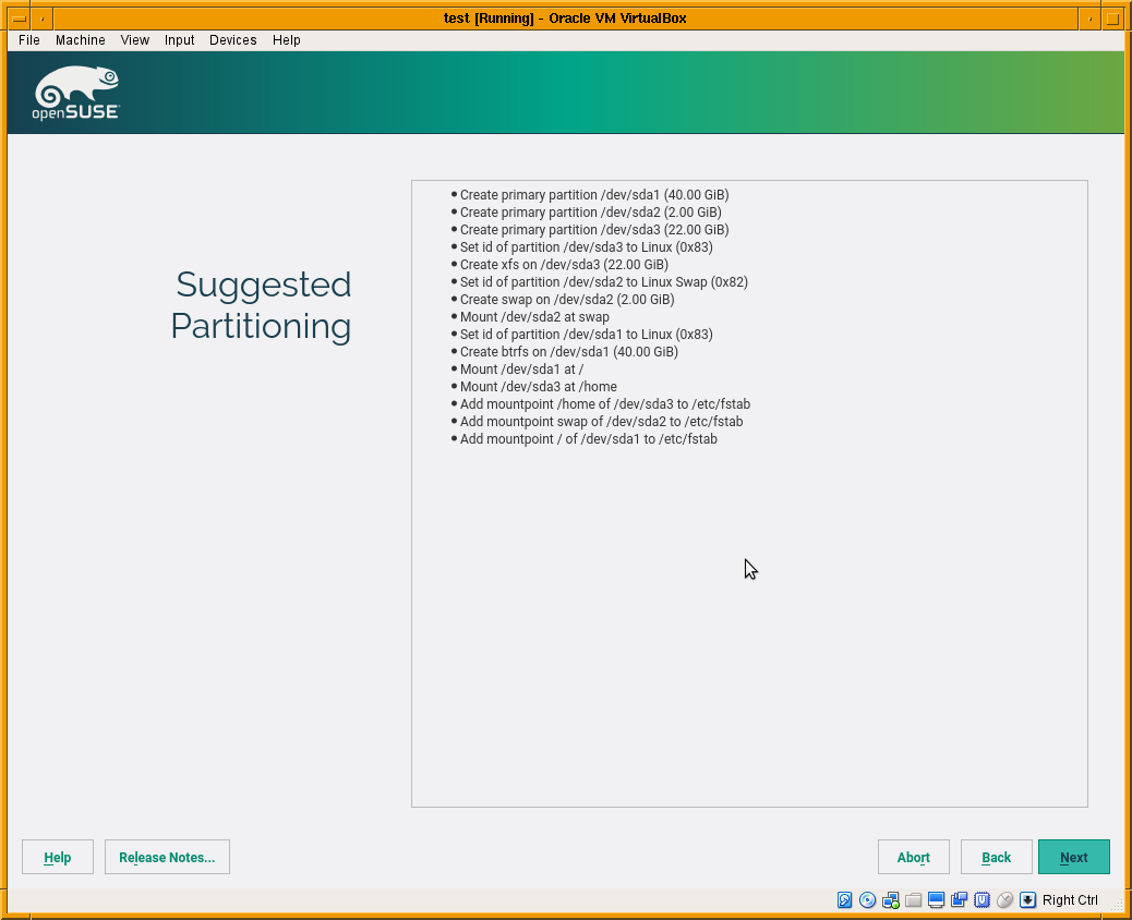 更重要的是,安装程序将显示使用新的堆栈计算的分区方案。如您在下面的屏幕截图中看到的,该屏幕比常规 Tumbleweed 中的屏幕简单得多。目前还没有更改设置或运行专家分区的按钮。这并不意味着该功能不存在,只是我们更喜欢先专注于将所有安装程序步骤修改为使用新的堆栈(这将使我们能够使用 openQA),然后再完善每个屏幕以添加所有选项。