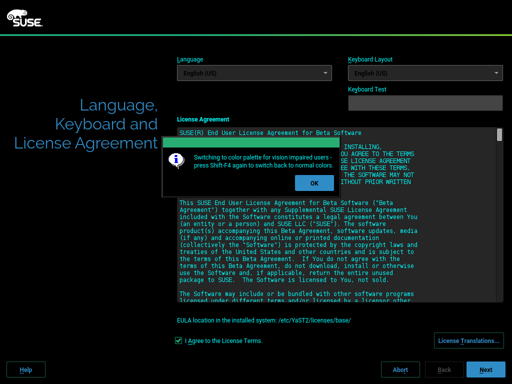 如今,YaST 团队正在努力修复安装程序中一个长期存在的问题:低视力可访问性。过去,用户可以在安装过程中按 shift+F4 获得高对比度模式。不幸的是,该功能不再起作用,而且坦率地说,更改为高对比度调色板是不够的。还应考虑其他调整,例如设置更好的字体大小。