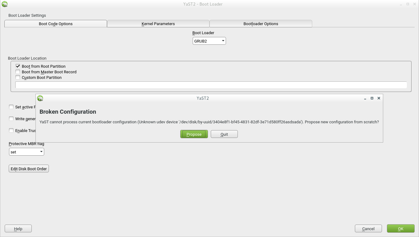 在某些情况下,YaST 引导加载程序无法读取系统配置。例如,当 Grub2 最初使用的 udev 设备不再可用时。过去,这会导致 YaST 崩溃,需要手动修复引导加载程序配置文件。现在 YaST 可以正确检测到这种情况,并提供使用正确的设备提出新配置的选项。