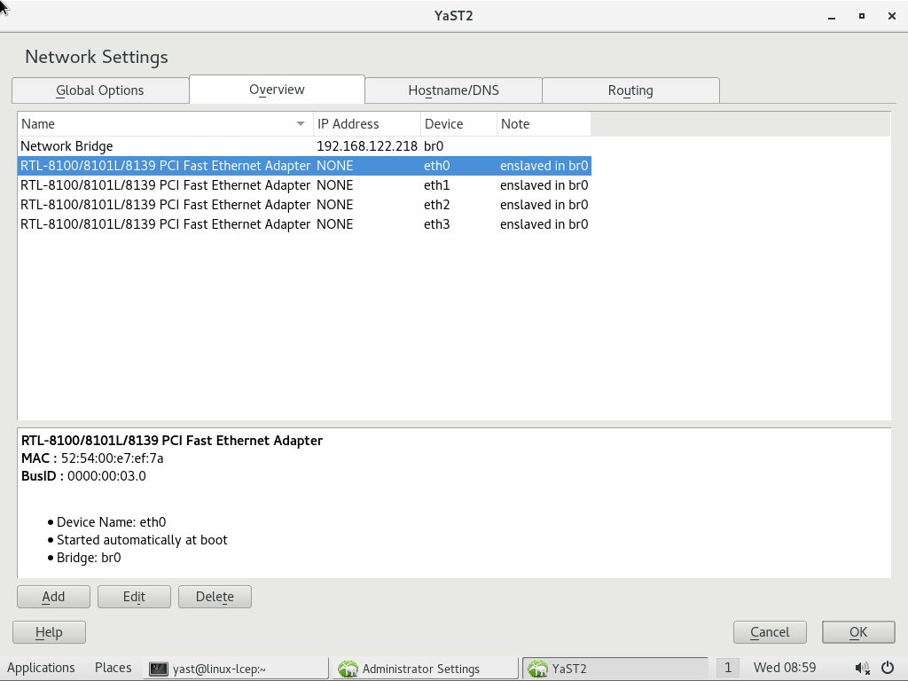 YaST 网络是用于网络配置的瑞士军刀,涵盖了路由、绑定、桥接和许多其他方面的管理。但坦率地说,桥接的管理并不是最好的状态。它存在相当多的可用性问题,并且与 (open)SUSE 中 Wicked 目前管理桥接的方式并不完全一致。直到现在!