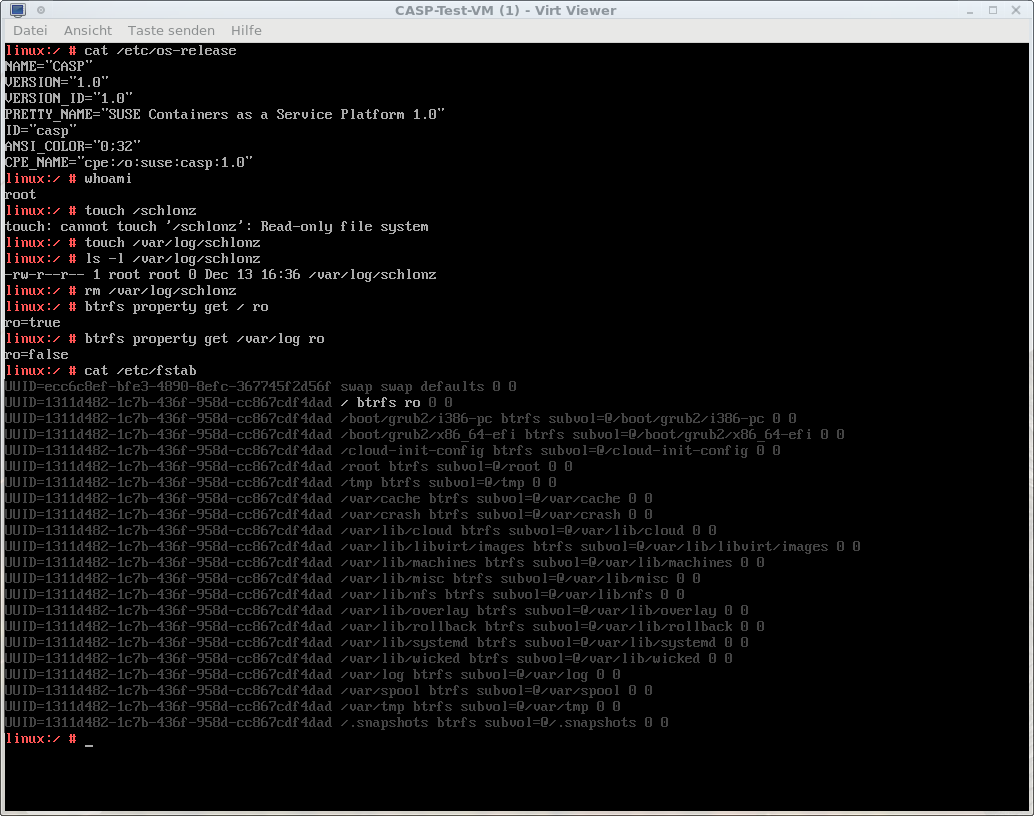 CASP 始终将 Btrfs 用作根分区的文件系统。安装结束时,根 btrfs 子卷将变为只读。所有其他子卷将保持为读写,如图所示,在安装过程结束后的重新启动后拍摄的屏幕截图。