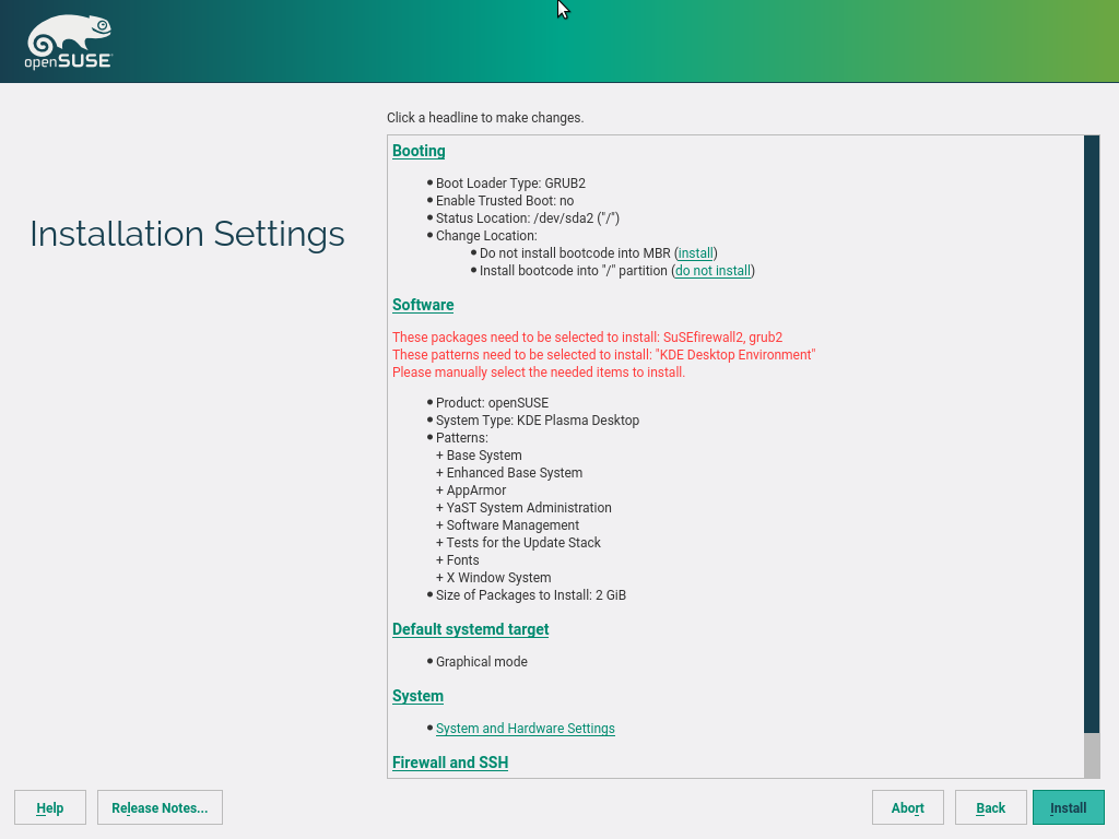 单击 安装 按钮后,安装将被阻止,用户必须通过重新选择软件包或调整相应的 YaST 配置(例如,不安装任何引导加载程序并禁用防火墙)来解决问题。