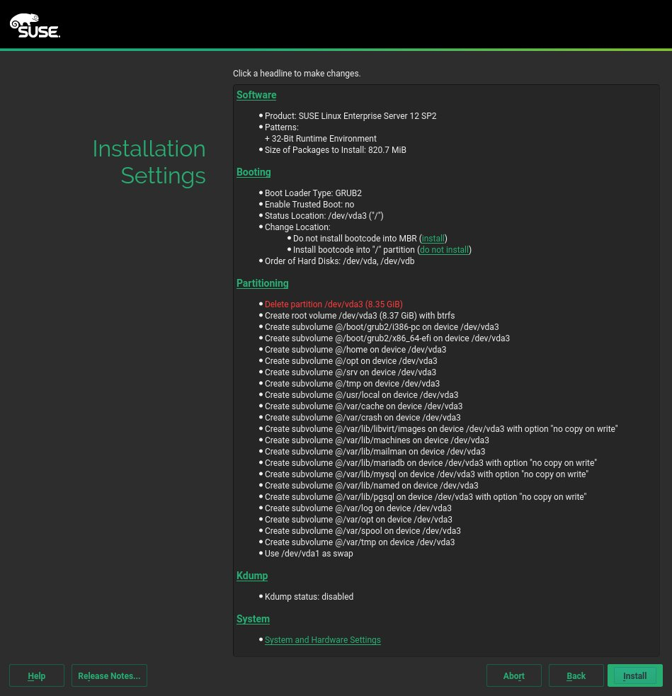 最后但并非最不重要的一点是,已经提到 CASP 安装工作流程将只有很少的步骤。这也影响了显示安装设置摘要的屏幕。与常规 SLES 相比,一些选项必须消失,因为它们不可配置,并且必须添加一些其他部分,因为它们不再作为单独的先前步骤呈现。到目前为止,这是当前 CASP 原型中安装设置屏幕的外观。