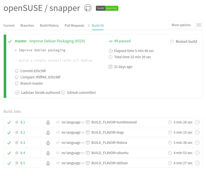 我们还为 Snapper 启用了 Travis 集成 Docker。如你所知,Snapper 是一种可移植的软件,它始终为许多 Linux 发行版提供 filesystems:snapper OBS 仓库中的软件包。