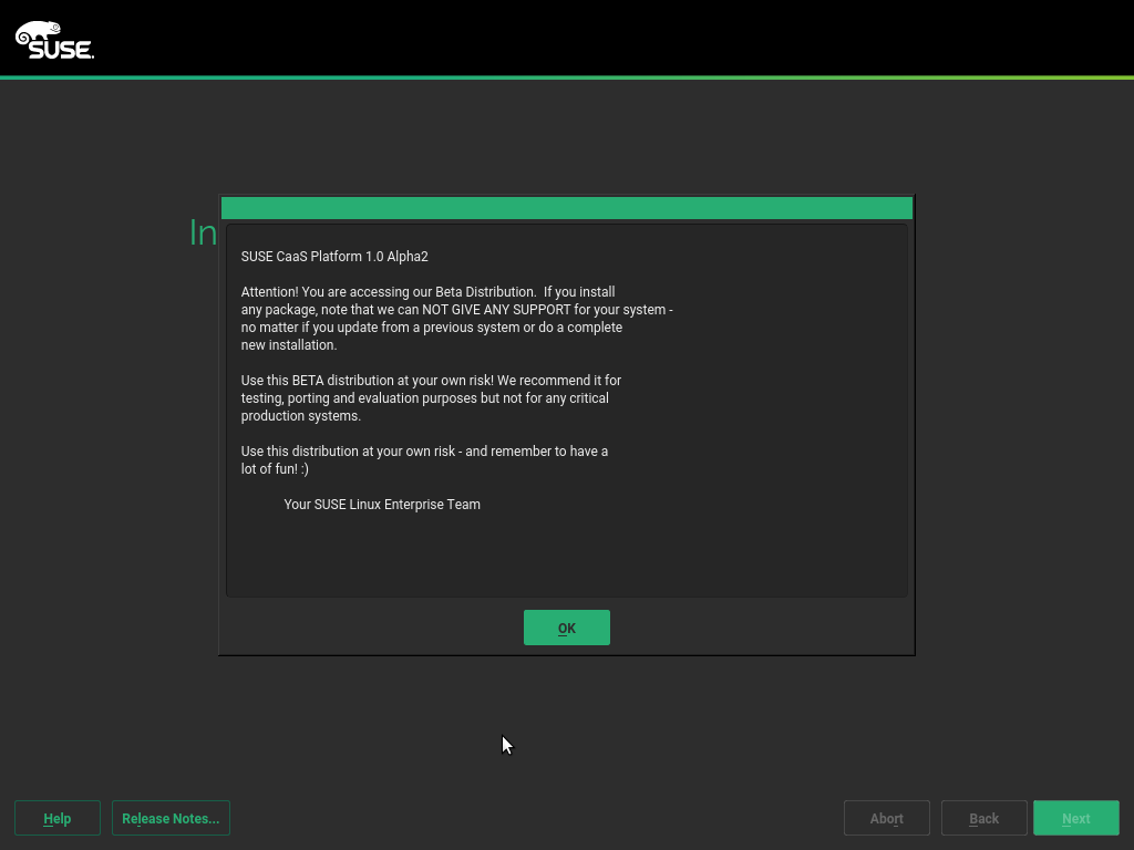 说到警告,我们改进了 CaaSP 安装对话框,以便在开始时显示 Alpha/Beta 产品警告。在更改 CaaSP 安装以使用我们在 上一篇博文中描述的全合一对话框后,此功能丢失了,因为它属于初始 EULA 对话框的一部分。现在它回来了,用户应该能够正确看到当前产品状态。