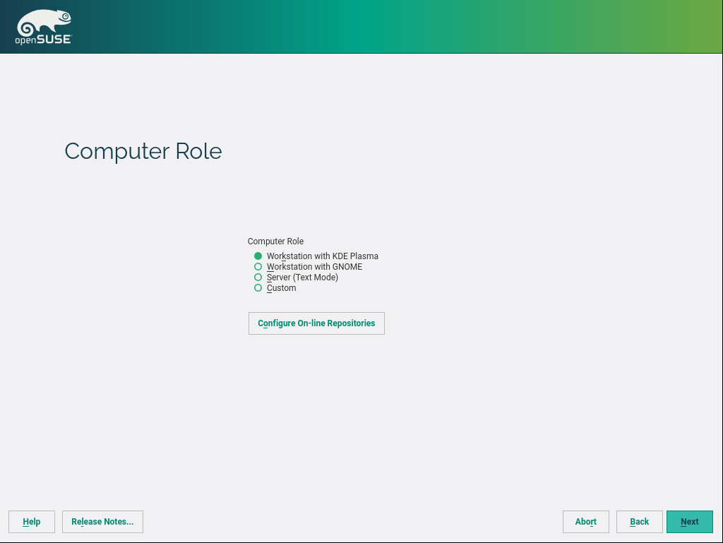 YaST 团队没有足够的时间和精力来关注所有这些桌面环境并评估哪些环境准备好安装程序的桌面选择屏幕。因此,openSUSE 发布团队决定用一些更通用但仍然对新手有用的东西来替换此对话框。