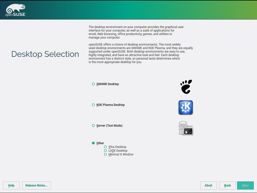 openSUSE 安装程序中的新桌面选择屏幕
