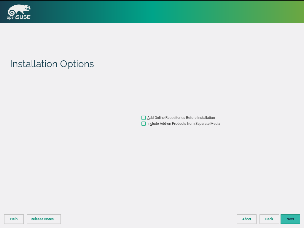 由于 openSUSE 不再生成插件,因此现在只有第二个复选框才有意义。此外,第二个复选框的功能直接影响可用模式的选择,因此将所有内容合并到一个屏幕中比为了适应一个复选框而增加一个额外的步骤更有意义。