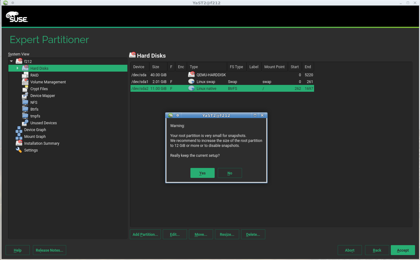 虽然我们正在开发新的存储系统,但我们仍在关注并改进当前的系统,该系统将继续与 SLE12-SP3、SUSE CaaSP 和 openSUSE Leap 42.3 一起提供。在此冲刺期间,我们对专家分区程序中与 Btrfs 子卷相关的可用性进行了两项改进。