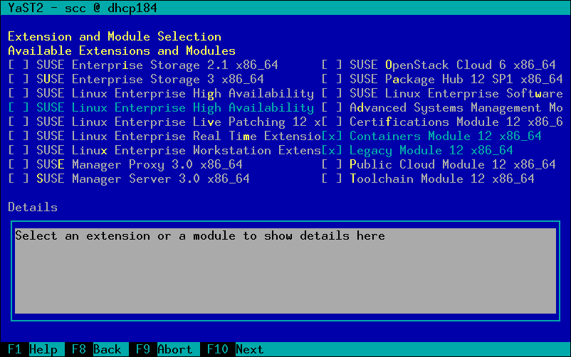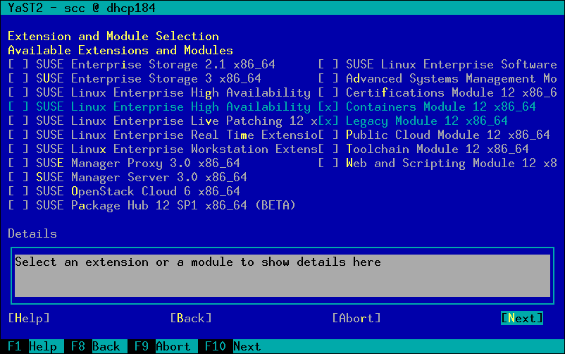 SLES-12-SP1 中选择附加组件的对话框最初仅设计用于少量附加组件。不幸的是(或者幸运的是,取决于您的看法),附加组件的数量随着时间的推移而增长,并超过了文本模式 UI 的原始限制。
