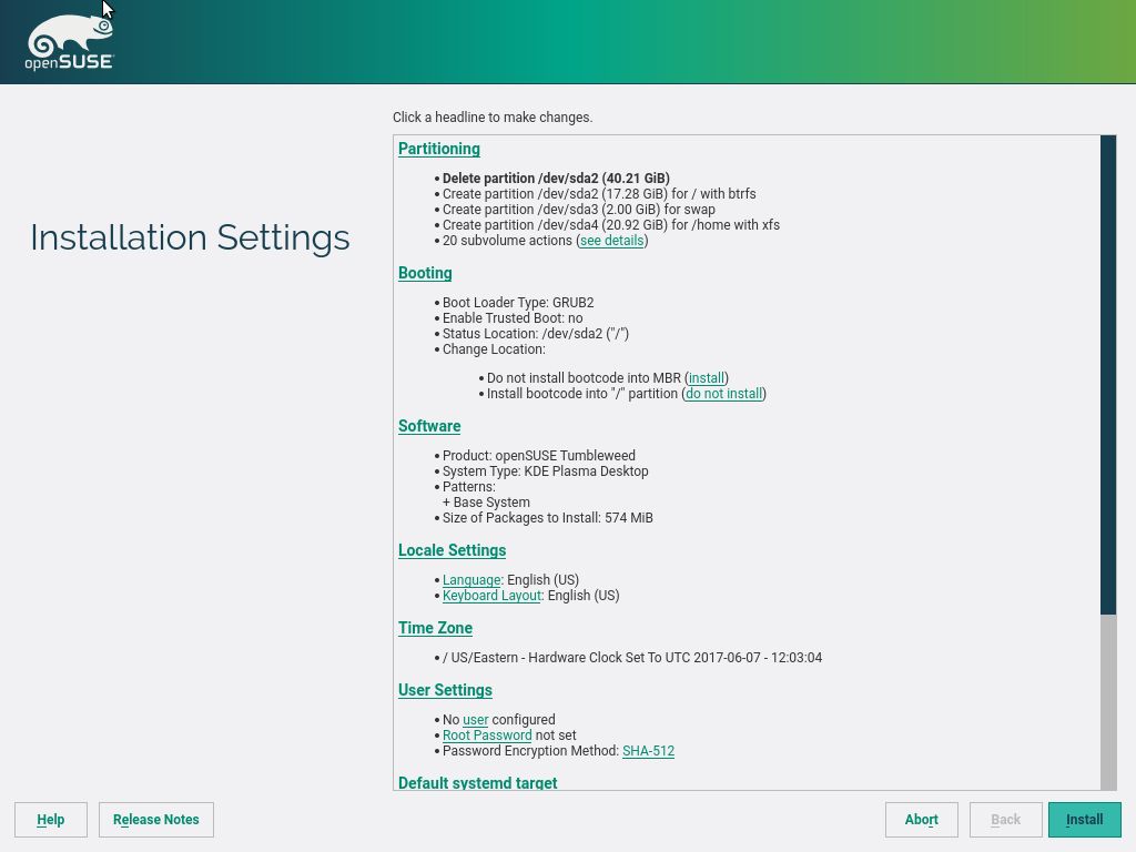AutoYaST 与新存储的集成也在此次冲刺中受到了我们的关注。现在,AutoYaST 中的摘要对话框以新的紧凑方式显示存储操作列表。目前无法从这个 AutoYaST 对话框编辑分区,但请关注即将到来的冲刺中的更多信息。
