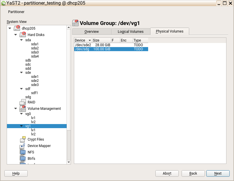 要试用它(在测试机器上!),请添加一个仓库并删除当前的存储库,如 yast-storage-ng: Trying on Running System 中所述,然后运行 zypper install yast2-partitioner。正如您可能注意到的,我们将分区工具拆分为一个单独的软件包,与当前版本作为基本 yast2-storage 的一部分不同。