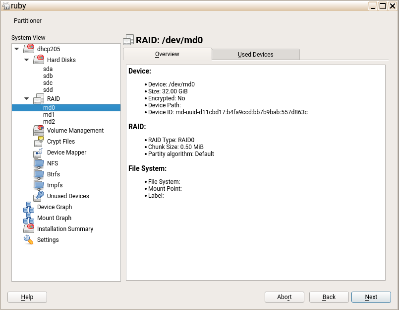 在此冲刺期间,我们教会了新的 libstorage 如何创建和管理命名的 RAID 阵列,除了已经支持的编号阵列之外。如果用户决定这样做,MD RAID 名称将用于 fstab,而不是 UUID(这是旧 libstorage 的唯一选项)。我们还确保在多种情况下改进行为,因此我们认为旧存储中的一些错误已通过 storage-ng 得到修复(或者如果你更喜欢,则已过时)。