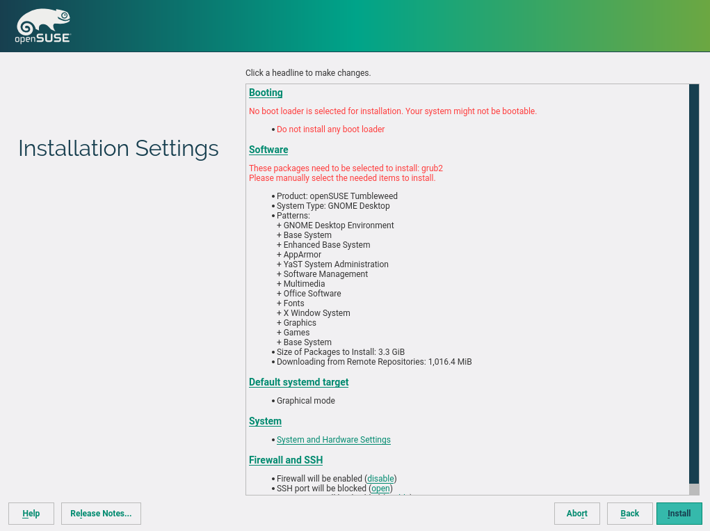 我们在 Tumbleweed 和 SLE 15 中更改了此行为,现在如果用户决定通过另一个操作系统管理引导加载程序,他们将能够安装系统中不需要的软件包。
