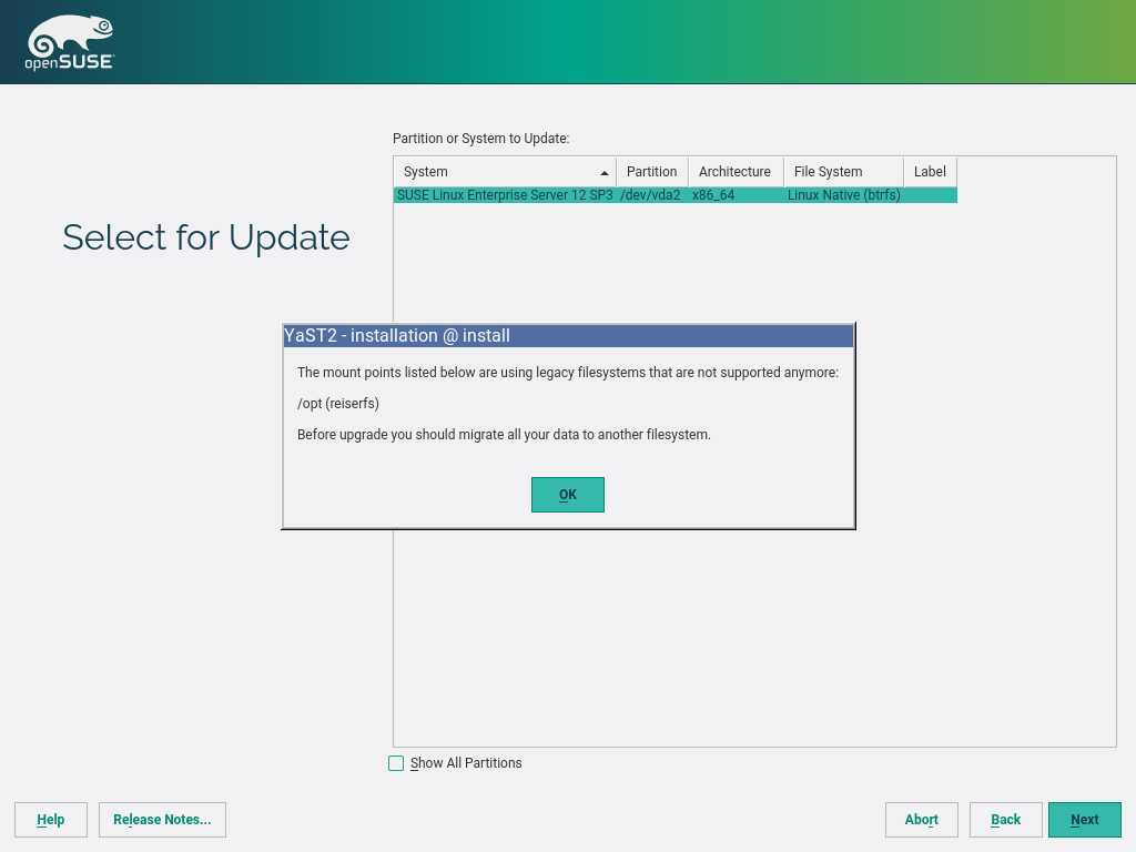 使用 SUSE Linux Enterprise 15 和 Leap 15,YaST 将完全删除对 ReiserFS 的支持,并且安装程序将阻止升级格式化为 ReiserFS 的系统。