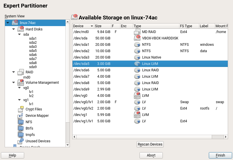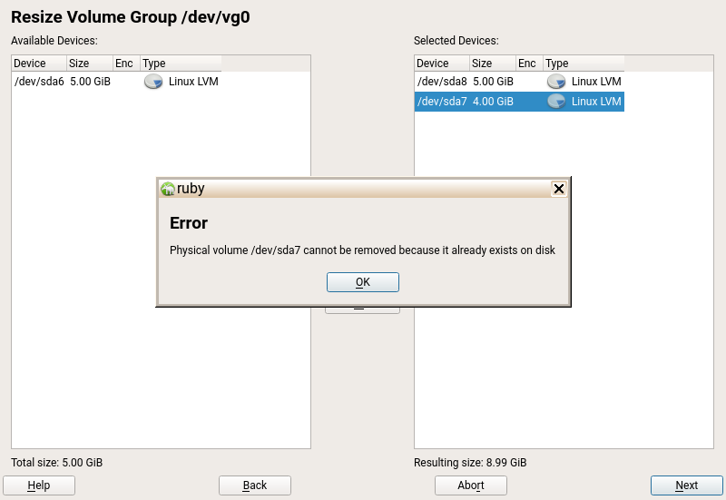 另一方面,在分区程序上下文中,调整卷组大小实际上意味着添加或删除物理卷。现在这些操作再次成为可能,包括相应的检查。例如,如果物理卷已存在于磁盘上(这可能会破坏您的数据),则无法删除物理卷,或者如果卷组的最终大小不足以覆盖所有逻辑卷,则无法删除。