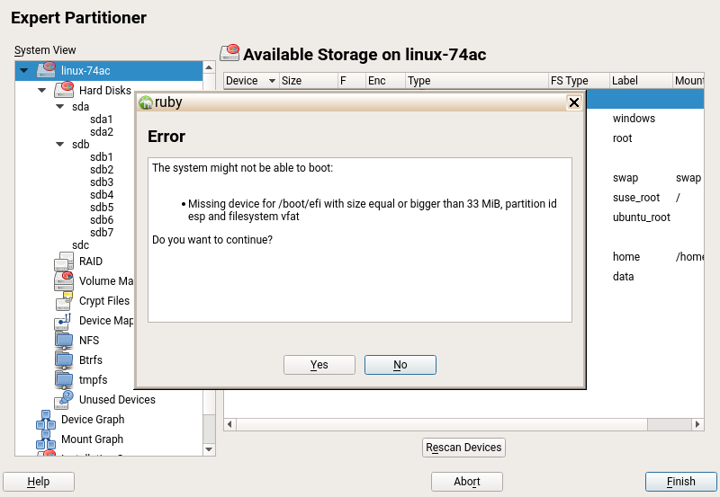 一旦用户设置了分区、LVM 卷、文件系统、挂载点等,并决定继续,分区程序将验证该设置,以确保它满足启动和运行系统所需的所有要求。当检测到问题时,将显示一个弹出消息,以显示问题是什么,并提供忽略警告并继续前进的选项。