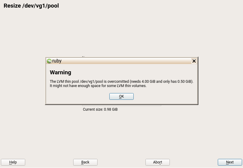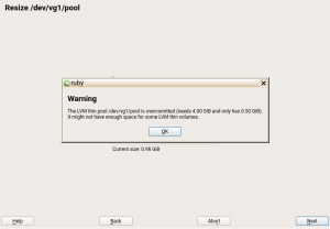 使用专家分区器,您可以以类似于创建普通逻辑卷的方式在 LVM 卷组上创建薄池。您只需添加一个新的逻辑卷并在第一个对话框中选中“薄池”选项即可。一旦卷组包含至少一个薄池,您就可以创建薄卷。再次,该过程完全相同。添加一个新的逻辑卷并选择“薄卷”选项以及要在哪个池中创建它。其余步骤与创建普通逻辑卷完全相同。