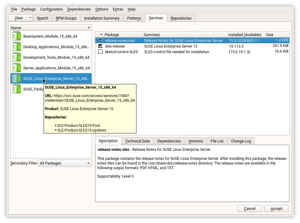 在软件管理模块中,我们有一个“存储库”视图,你可以在其中查看按提供它们的存储库分组的软件包。但这对于查看产品扩展或模块提供的软件包没有太大帮助,因为每个产品模块由多个存储库组成:最初发布的软件包、更新、源代码、调试信息。