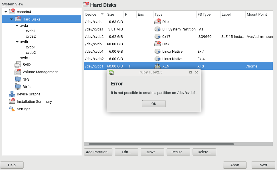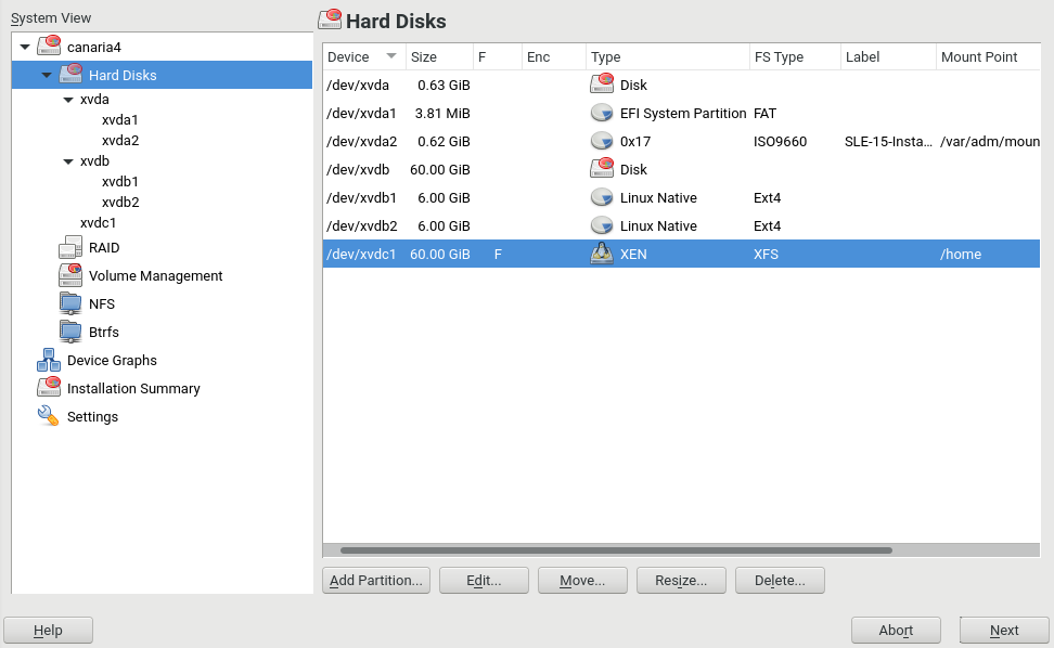 它的工作方式类似于旧的(预 Storage-NG)分区程序,但没有用于将虚拟分区分组的人工磁盘。请参阅以下屏幕截图,其中 xvda 是 DVD,xvdb 是真实磁盘,xvdc1 是 XEN 虚拟分区(没有 YaST 添加的虚假 xvdc)。