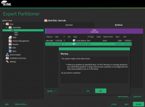 正如我们的读者所知,yast-storage-ng 的主要目标之一是提供更可靠和精确的诊断,以确定需要创建哪些分区,以确保要安装的新系统能够启动。如果有什么不符合这种诊断,安装程序会显示警告消息。