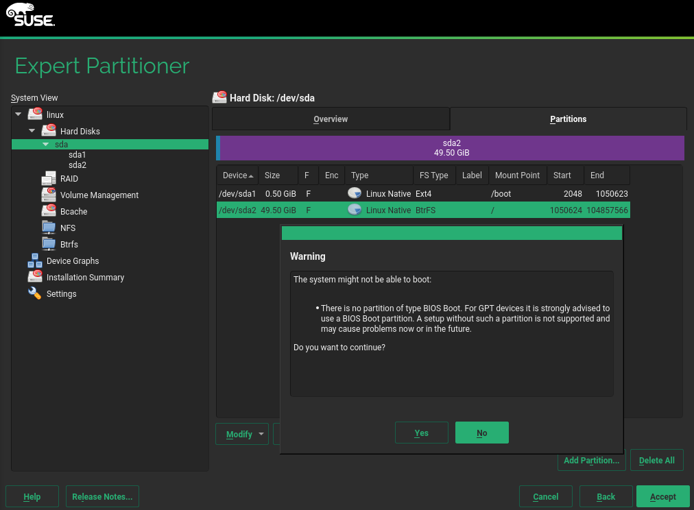 在启动安装在 GPT 设备上的系统时,使用传统 BIOS 系统(与 EFI 相对),这意味着 SLE-15 和 openSUSE Leap 15.0 如果没有 BIOS Boot 类型的分区,会警告用户。但其中存在两个问题。