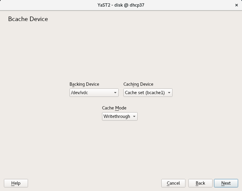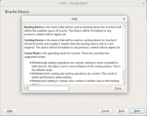 如 上一篇博客文章 中所示,我们目前正在致力于将 Bcache 支持添加到 YaST 分区器中。这次我们允许配置新 bcache 设备的缓存模式。如果您不确定特定的缓存模式意味着什么,我们还提供了相当详细的帮助文本。除了这种配置,我们还限制了操作,以防止数据丢失或可能导致不可靠结果的操作。这里有一些截图