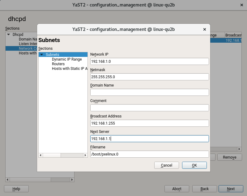 上面的屏幕截图属于一个相当复杂的 dhcp 公式。在左侧,有一个树,您可以使用它来浏览公式。在右侧,YaST 显示一组用于输入公式参数的表单控件。