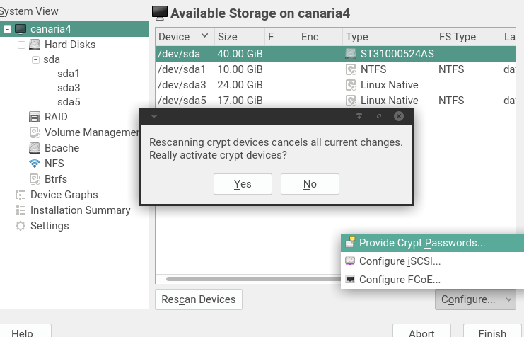 尽管如此,在已经安装的系统上执行 YaST 分区程序的的用户可能希望激活当前非活动设备。为了允许这样做,我们将“提供加密密码”按钮带回,但与它过去的行为相比,有两个小的变化。