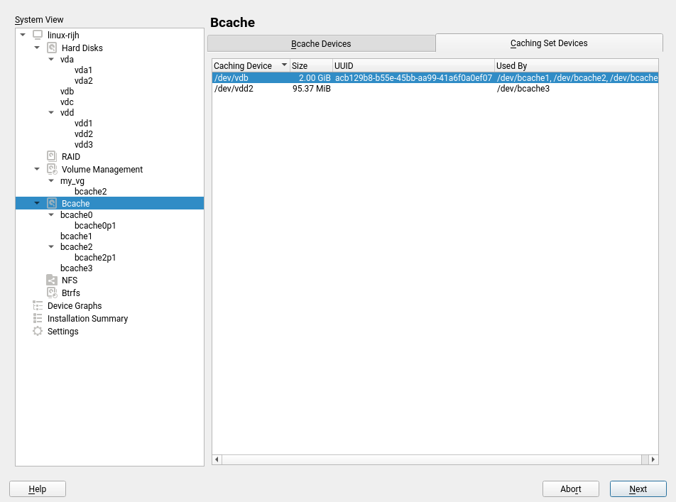 现在我们将详细介绍这三项改进。但为了庆祝分区程序中的 Bcache 支持看起来已经完成,我们发布了一篇 单独的博文,解释了什么是 Bcache 以及如何使用 YaST 分区程序利用该技术。尽情享受吧!