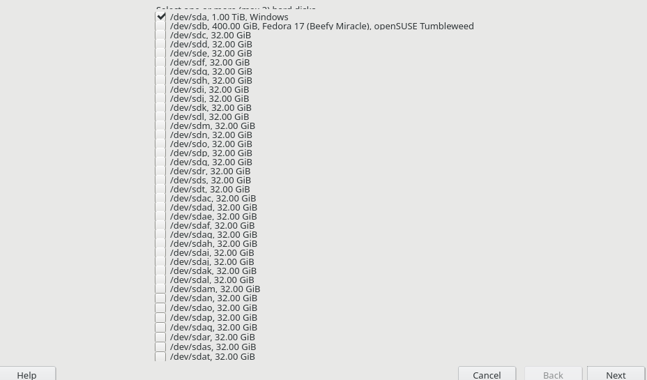 但是,如果系统包含超过 10 个磁盘可供选择,则将使用不同的小部件,该小部件可以实现滚动,从而确保用户界面在图形模式和基于文本的模式下都保持可用。
