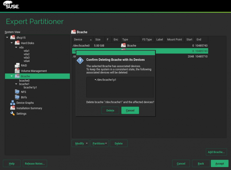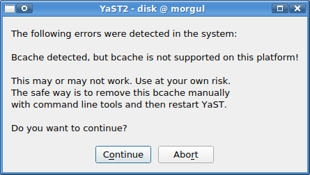 因此,即使在找到 Bcache 设备的极不可能的 Unsupported 系统中,YaST 分区程序也仅会在 x86_64 系统中显示左侧树中的“Bcache”部分。如果甚至发生这种情况,YaST 会提醒用户在 Unsupported 场景中使用 Bcache 的危险,并敦促他们使用手动程序来修改现有的设置。
