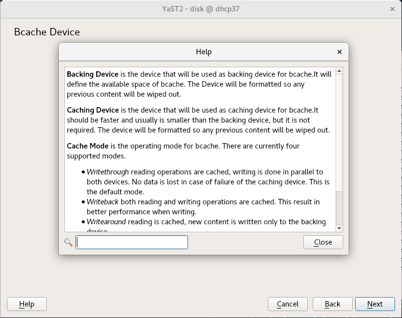 如前所述,第三个字段允许你选择 Bcache 提供的缓存模式之一。如果你不确定特定的缓存模式意味着什么,YaST 还提供了相当详细的帮助文本来解释它们。