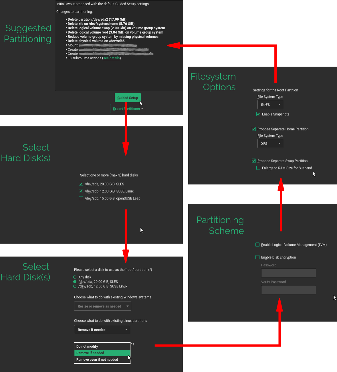 但是,除了“引导设置”按钮之外,两种不同的分配模式的可用性还引发了一个想法,该想法自从 Storage-ng 引入以来一直存在——在专家分区器中添加一个“向导”部分。这将允许将一些手动步骤与执行两种可用分配模式的任何一种或与将来可以实现的任何其他工作流程结合起来……