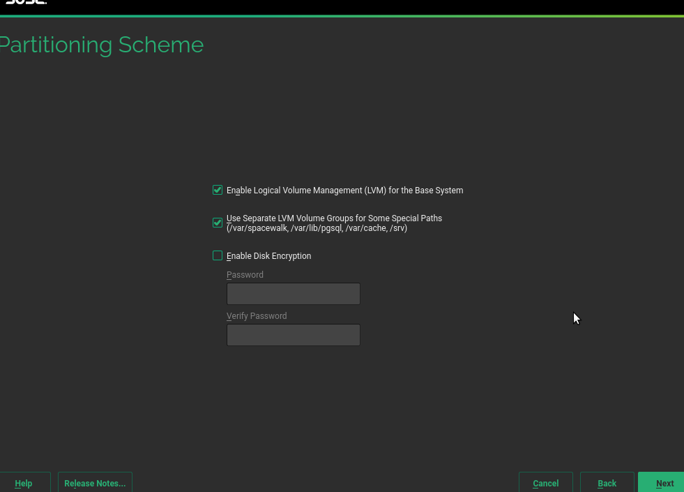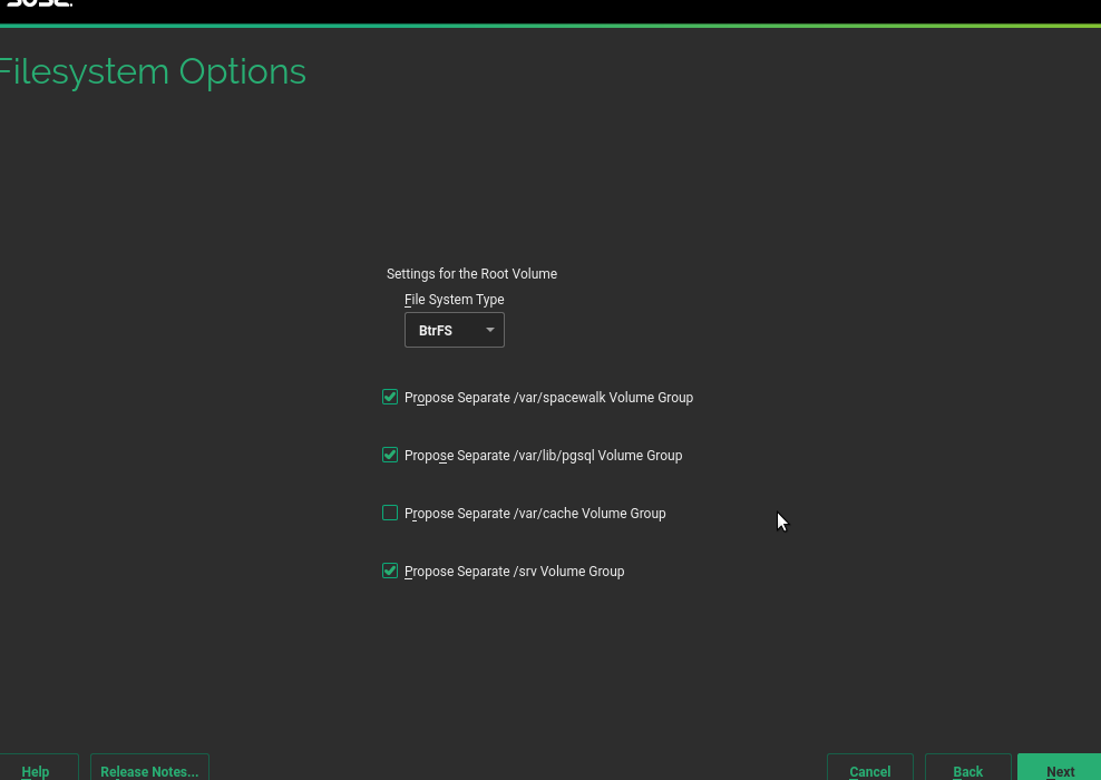 每个系统角色配置的最重要的设置是所谓的 volumes 列表。该列表包括引导设置应作为单独分区或 LVM 逻辑卷创建的所有文件系统(包括强制的和可选的)。现在可以使用新的属性 separate_vg_name 指定可以将其创建在自己的单独 LVM 卷组中。如果当前产品和角色定义的任何卷包含此类属性,则选择架构的屏幕将在通常的 LVM 相关选项下方包含一个额外的复选框。
