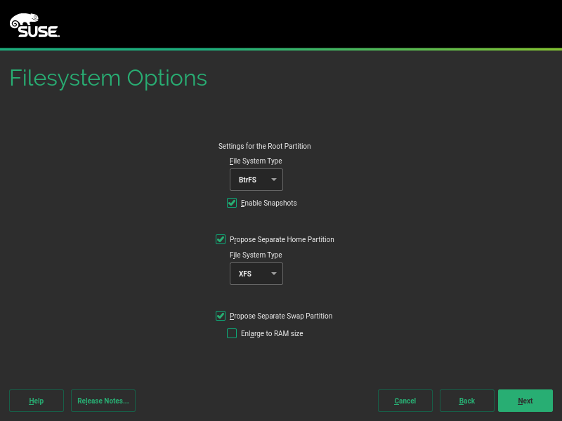 出于许多原因,IBM z 系统架构 (s390) 是 YaST 灵活性至关重要的特殊情况之一。YaST 提供的许多选项之一称为 adjust_by_ram,它指示 YaST 确保给定的卷大小至少与系统 RAM 一样大。显然,当我们要能够将系统挂起到磁盘时,此选项对于交换卷特别有用。