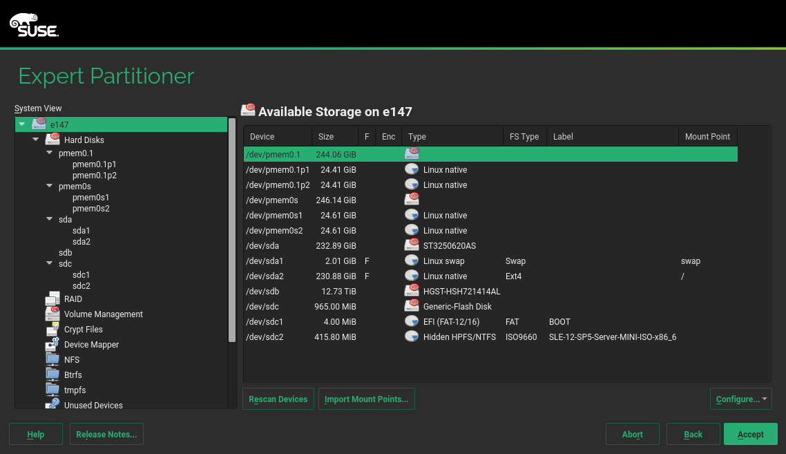 在此次冲刺期间,SLE 12 获得了从 SLE 15 回移植的两个有趣的功能。第一个是指定内核缓解设置的能力,就像您现在可以在 Tumbleweed 中做的那样。第二个是支持 PMEM 设备,如下面的屏幕截图所示。