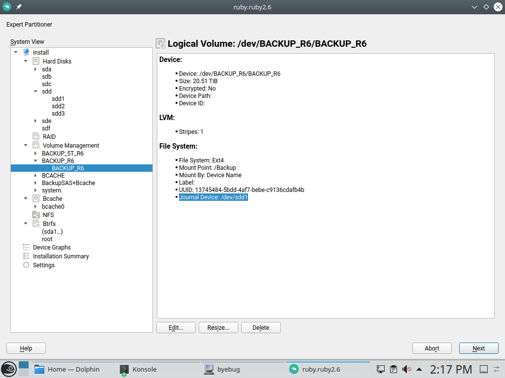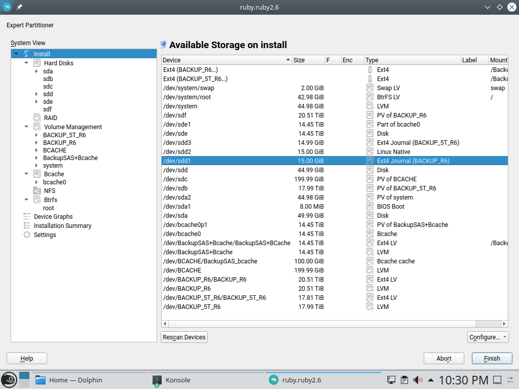 我们收到了一份 错误报告,该报告是由对多设备文件系统的这种误解引起的。专家分区程序将用作 Ext4 文件系统外部日志的设备标记为“Btrfs 的一部分”。因此,我们在上次冲刺期间对此进行了改进,现在外部日志设备在专家分区程序的类型列中得到正确指示,如下面的屏幕截图所示。