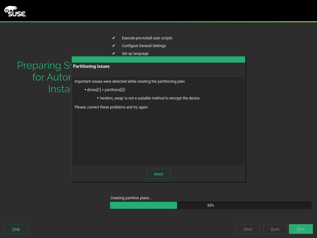正如我们希望 AutoYaST 尽可能用户友好,如果您在设置加密配置时犯了错误,它将尝试帮助您,如屏幕截图所示。