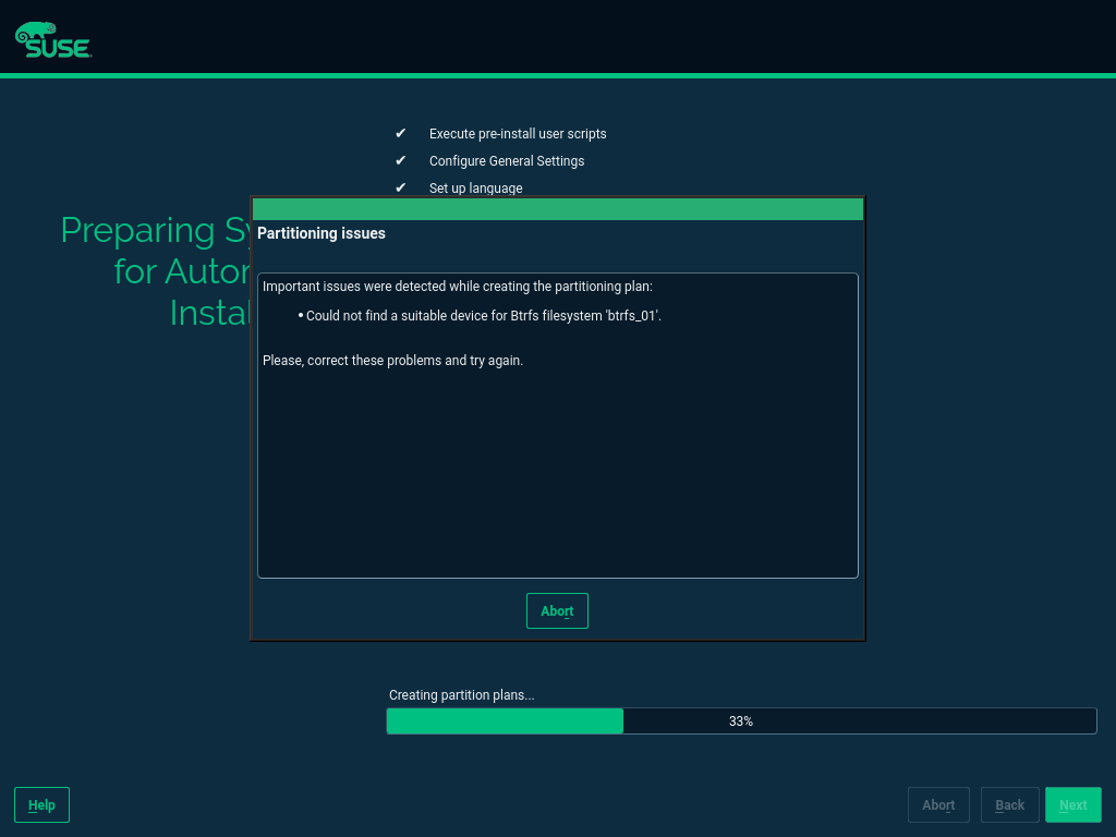 在下面的图像中,您可以查看错误报告机制的外观。在此示例中,它报告 AutoYaST 配置文件包含一个新的多设备 Btrfs 文件系统,但它没有指定哪些磁盘或分区应该是该文件系统的一部分。