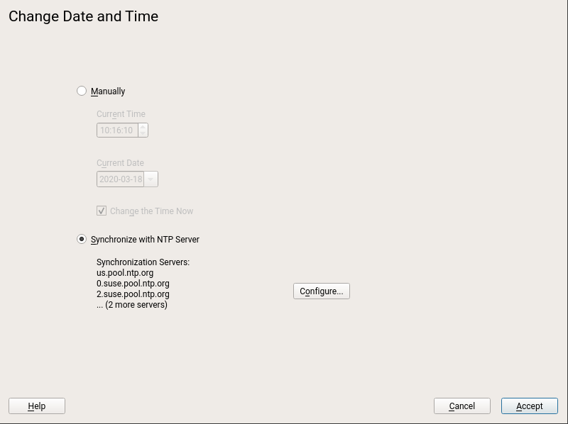 YaST NTP 允许配置用于同步系统日期和时间的 NTP 服务器列表。但是,我们心爱的用户之一报告说,YaST 时区模块中的某个步骤序列可能会破坏该列表,将其减少到仅其第一个条目。这是由于两个 YaST 模块之间缺乏一致性造成的。