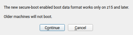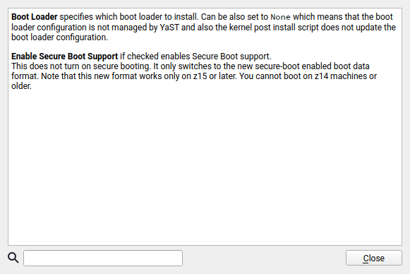 现在,YaST 行为更好地适应了其执行系统的特征。我们可以详细介绍每个 zSeries 型号以及 YaST 如何根据其硬件配置进行行为。但既然一图胜千言,让我们用这个新的警告来说明一下,当启用安全启动支持时会显示 z15+ 要求。