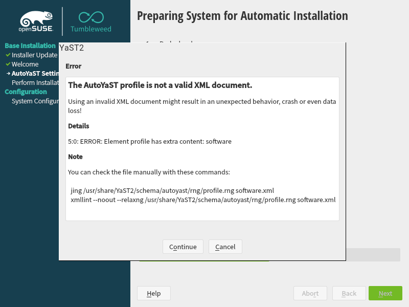 - 在安装开始时验证 AutoYaST 配置文件(见下方截图)。