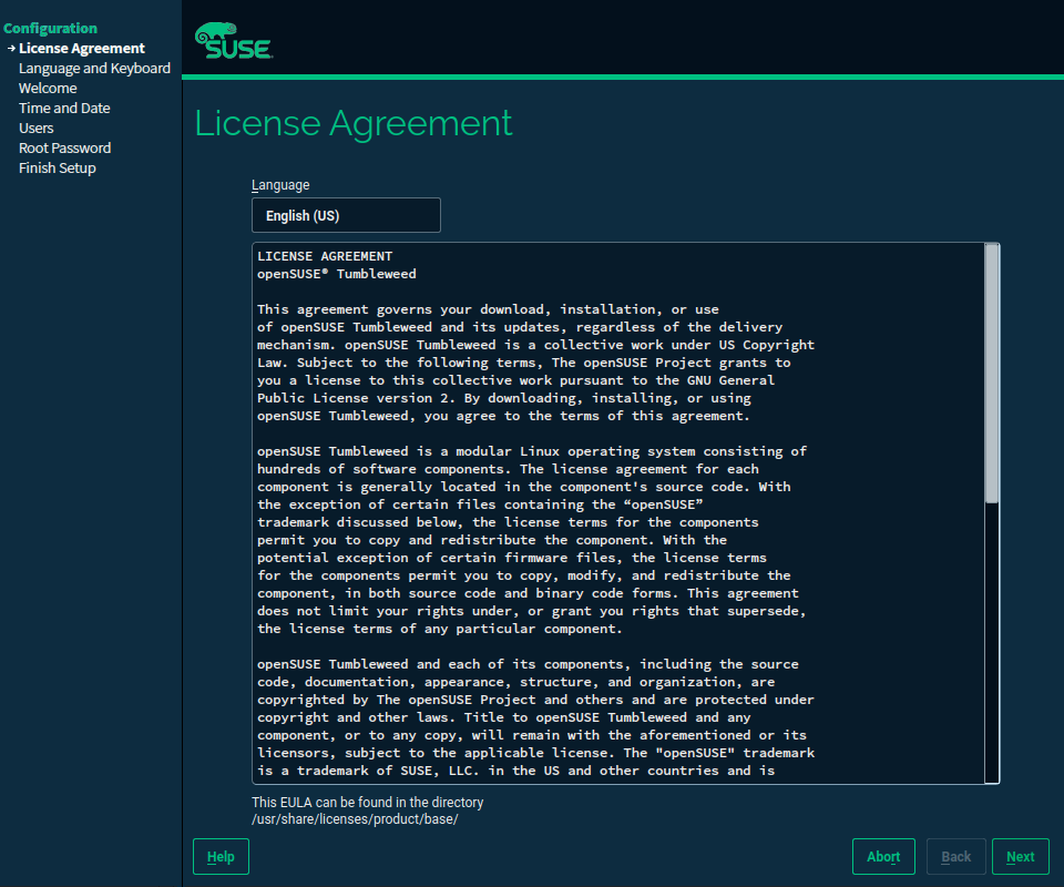 带有布局 title-on-left 且没有横幅的 YaST Firstboot。