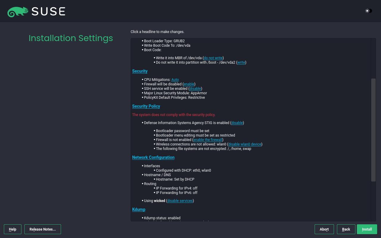 因此,我们正在积极地将安全策略的概念添加到交互式安装 (https://github.com/yast/yast-security/pull/128) 和 AutoYaST (https://github.com/yast/yast-autoinstallation/pull/845) 中。 这仍在进行中,当功能准备好发布到仓库时,我们将提供更详细的审查。